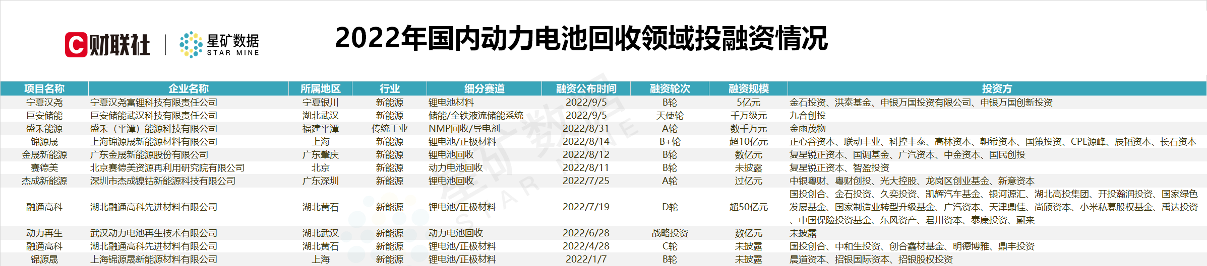 创道咨询合伙人步日欣对《科创板日报》记者表示,电池回收有两大确定性,一方面,电动新能源汽车的趋势日渐明晰,渗透率逐年提高,未来动力电池必然面临一个报废回收的问题;另一方面,报废的动力电池回收再利用,能够在一定程度上降低电池成本,并且缓解锂等核心资源的短缺问题。财联社创投通显示,今年以来,动力电池回收已完成十余起融资,尤其在7月以来融资明显提速。其中,融通高科同样在一年内完成两轮融资,7月19日公布的D轮融资额高达50亿元。共有19家投资方,包括国家绿色发展基金、国家制造业转型升级基金、中国保险投资基金等国资、险资基金,广汽资本、东风资产、上汽旗下尚颀资本、蔚来等车企资本,以及小米私募股权基金、国投创合、金石投资等头部机构。