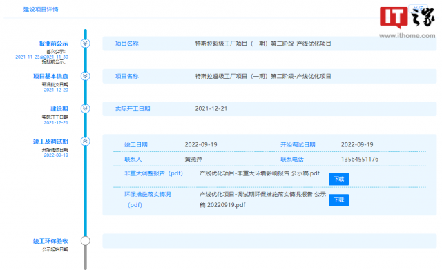 9 月 19 日消息,今日,上海企事业单位环境信息公开平台公示了特斯拉超级工厂项目(一期)第二阶段-产线优化项目。公示信息显示,特斯拉上海超级工厂产线优化项目已经于今日竣工,并将开始进行调试。