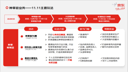 在图文方面,京东11。11的“种草官”、“发现好货”、“评价问答”将构建种草内容营销场。“种草官业务”将推出“种草PK赛”、“京东百人种草天团”、“购后分享有礼”三大玩法,“发现好货”业务也在11。11期间进行了全新升级,“加心愿单解锁爆品大额券”和“拼团心愿秒大额券”两大玩法持续吸引用户。“评论问答业务”也将给予商家更多主动权,商家将会拥有优先回答的权限,直播间问答业务也将帮助主播高效解决消费者的购前决策问题,加速转化。