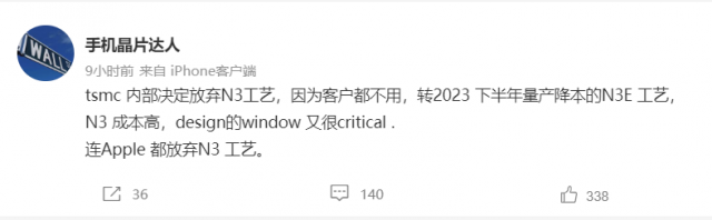 8月27日,据手机晶片达人在微博上的爆料信息,台积电内部决定放弃N3工艺,因为客户都不用,转2023下半年量产降本的N3E工艺,N3成本高,design的window又很critical,连苹果都放弃N3工艺。