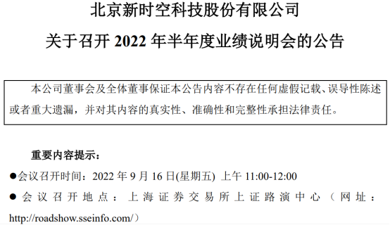 近日,时空科技发布公告称,公司将于9月16日上午11:00-12:00以网络互动形式,在上海证券交易所上证路演中心召开2022年半年度业绩说明会。