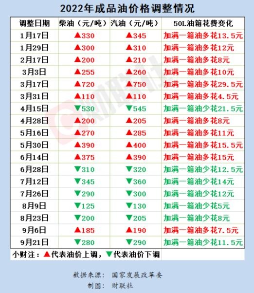 9月21日电,根据国家发改委消息,新一轮成品油调价窗口将于今天(9月21日)24时开启。本次油价调整具体情况如下:国内汽、柴油零售限价每吨分别下调290、280元。全国平均来看:92号汽油下调0。23元;95号汽油下调0。24元;0号柴油下调0。24元。按一般家用汽车油箱50L容量估测,加满一箱92号汽油,将少花11。5元。