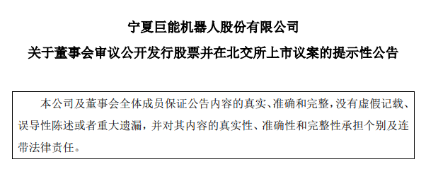 近日,宁夏巨能机器人股份有限公司(下称“巨能机器人”)发布公告,拟申请向不特定合格投资者公开发行股票并在北交所上市。