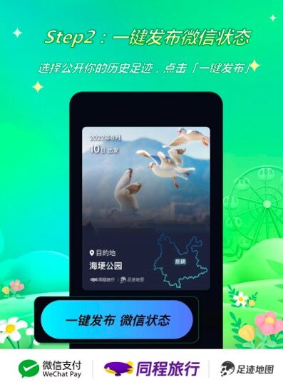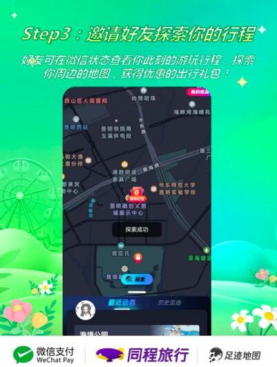 为了进一步丰富旅行社交的体验感,同程旅行与微信状态打造了“足迹地图探索”玩法。