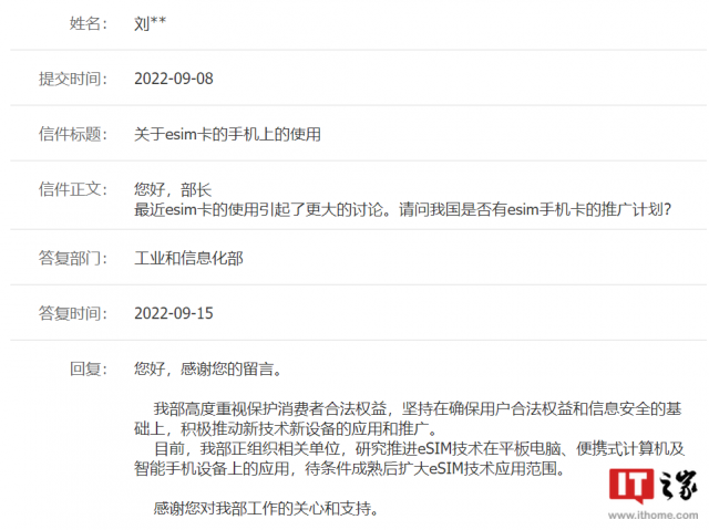 近日,有网友在工业和信息化部官网留言询问了关于 eSIM 卡的问题,称最近 eSIM 卡的使用引起了更大的讨论,请问我国是否有 eSIM 手机卡的推广计划?