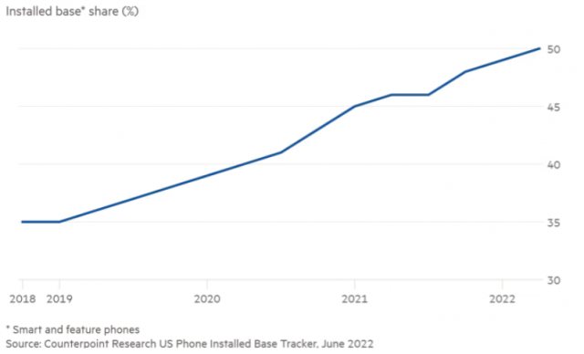 9 月 3 日消息,自 2007 年发布以来,苹果iPhone 在美国的市场占有率就一直没有超过竞争对手安卓,但今年第二季度这一情况迎来的变化,据行业分析公司 Counterpoint Research 最新报告,今年第二季度,苹果在美国智能手机市场所占份额已经超过 50%,达到 2007 年首次面世以来最高,可谓是苹果的一个里程碑似的事件。