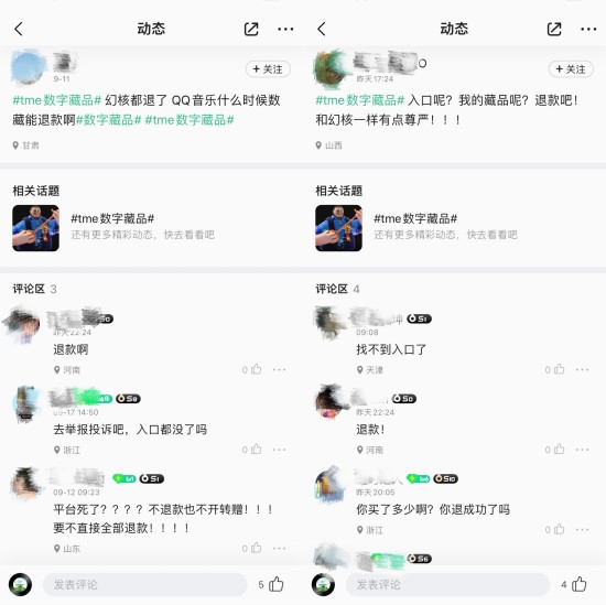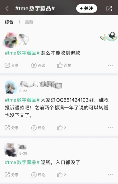 2021年8月,TME数字藏品正式上线。今年8月起,有用户反映,已经在QQ音乐上找不到TME数字藏品的入口了。目前,QQ音乐社区#tme数字藏品#的话题下,已有部分TME数字藏品用户要求像幻核一样“退款”。