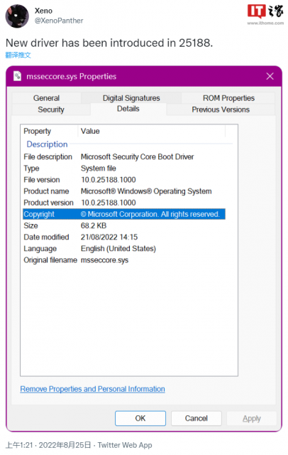 尽管日志里没有提及,但微软可能已经开始对 Windows 11 安全性进行了一些增强。Twitter 用户 Xeno 发现,该预览版中存在用于 Microsoft 安全核心启动 (msseccore。sys) 的新更新驱动程序。更新的驱动程序版本号为 10。0。25188。1000,清楚地表明它已更新为最新版本。