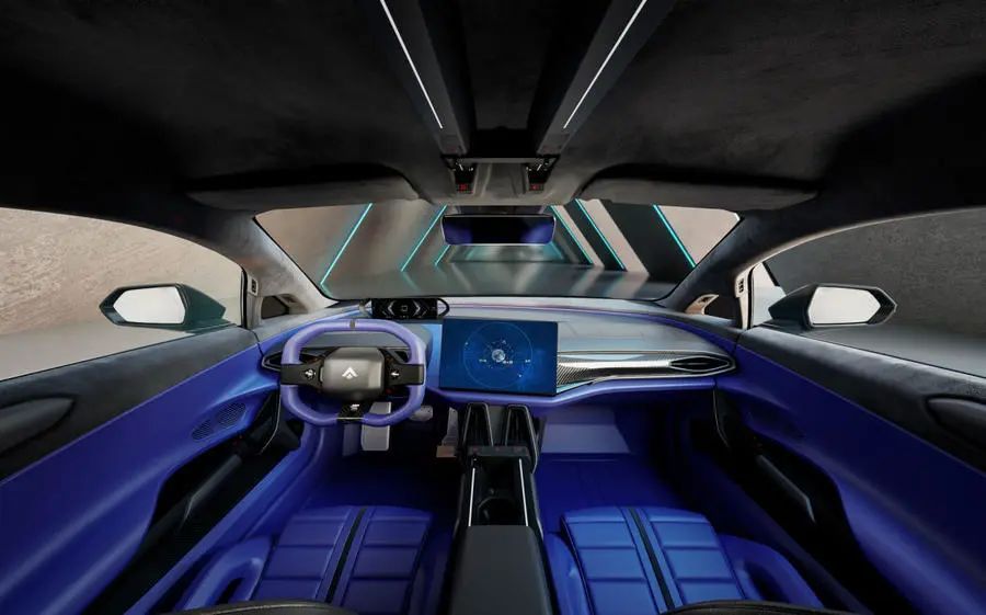 蓝色与紫色搭配的氛围灯,突显时尚感。整体内饰采用简洁而运动的设计风格,与高端跑车的定位相呼应。8。8英寸仪表盘搭配14。6英寸多媒体显示屏,提升了车内的科技感。换挡拨杆采用独特的左右拨动设计,整体造型非常简洁精巧,方向盘采用方形设计,并配以碳纤维元素,座椅采用赛车座椅,包裹性十分优越,同时使用了颇具高级感的皮质,从而营造出一种超跑独有的豪华感。
