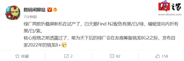 据数码博主 @数码闲聊站 今日透露,OPPO 代号“白天鹅”的 OPPO Find N 2 和代号“蜻蜓”的竖向折叠屏手机已经试产,其中OPPO Find N 2 折叠屏手机将拥有黑、白、绿三款配色,代号“蜻蜓”的竖向折叠屏手机将拥有黑、白、紫三款配色。该博主还表示,这两款折叠屏手机将搭载高通骁龙 8+ Gen 1 处理器。