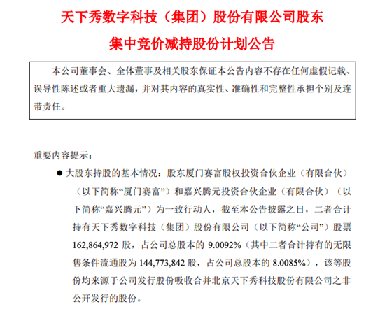 截至本公告披露之日,二者合计持有天下秀数字科技(集团)股份有限公司(以下简称“公司”)股票 162,864,972股,占公司总股本的 9。0092%(其中二者合计持有的无限售条件流通股为 144,773,842股,占公司总股本的 8。0085%),该等股 份均来源于公司发行股份吸收合并北京天下秀科技股份有限公司之非公开发行的股份。