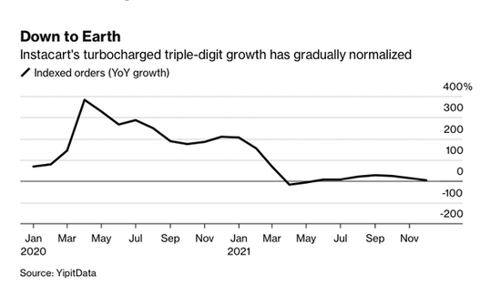 红利结束,通货膨胀飙升,科技类股大跌,那些期间强劲增长的“股”的好日子彻底结束了。而作为其中最具代表性的股,跑腿平台Instacart也经历了残酷落差:不仅业务大幅下滑,连上市都大打折扣了。