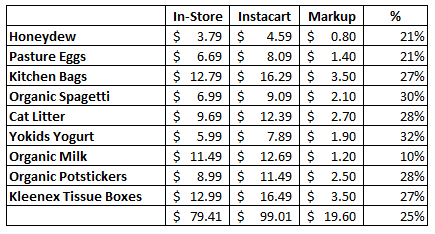 Instacart的商业模式很简单,没有自己的商品仓储。用户在他们网站下单之后,Instacart的买手(送货员)就从合作的线下商家处提货再送到消费者手中。当然,Instacart上的商品定价是高于合作商家的,此外消费者还要支付服务费和配送费,还要给送货员至少5%的小费。