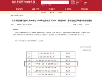5月24日消息,北京市经济和信息化局发布了2022年度第三批北京市专精特新中小企业名单,智能物联网平台中科物栖等762家企业入选。