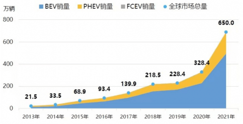 据EV Volumes, CAAM 公布的数据显示,2021年全球新能源汽车销量近650万辆,同比增长108%,中国市场新能源汽车销量达到352万辆,同比增长157。5%,约占全球市场的一半,汽车电动化趋势明确。