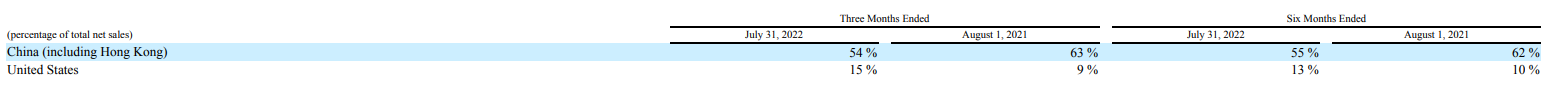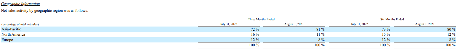 2023财年第一季度,Semtech亚洲、北美和欧洲市场的发货量分别占净销售额的72%、16%和12%。