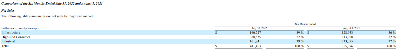 Semtech业务终端市场主要包括基础设施(infrastructure)、工业(industrial)、高端消费(high-end consumer)三大市场: