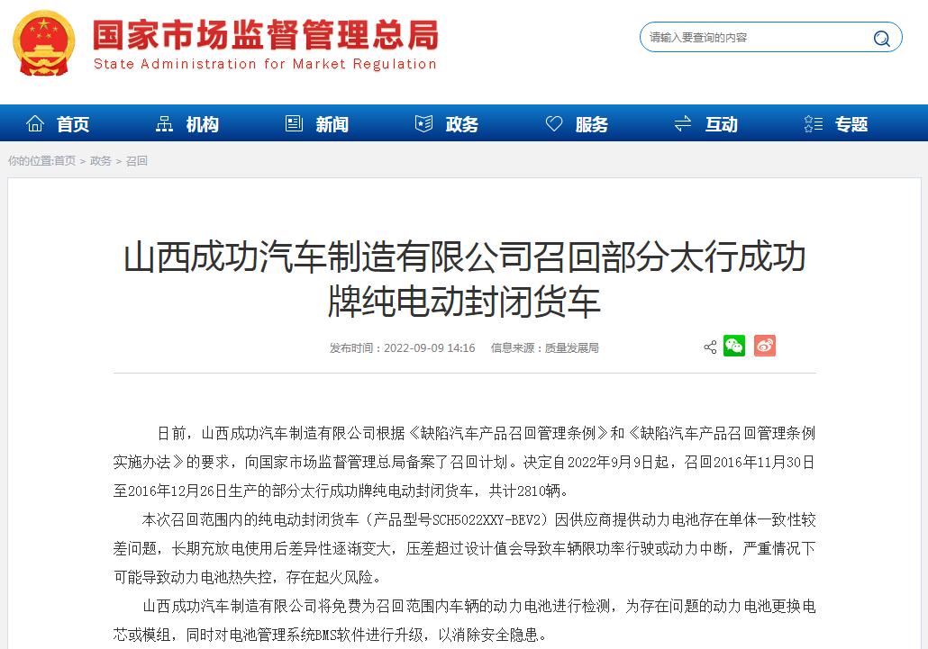 成功汽车决定自2022年9月9日起,召回2016年11月30日至2016年12月26日生产的部分太行成功牌纯电动封闭货车,共计2810辆。