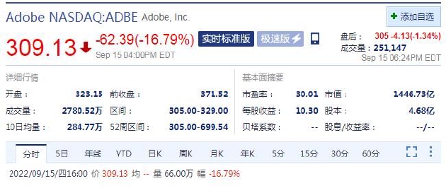 北京时间9月16日凌晨消息,美股周四收盘,Adobe股价大跌16。79%,报309。13美元。Adobe此前宣布,已与初创公司Figma签署最终的收购协议,将以约200亿美元的现金和股票收购Figma,后者是一家开发“在线设计协作工具”的初创企业。