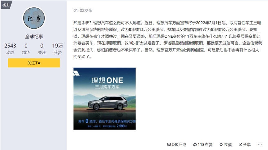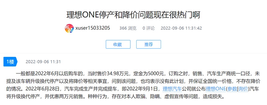 9月1日,理想汽车宣布理想ONE车型降价两万并且停产。消息一出,刚刚买理想ONE的车主开始,随后事态愈演愈烈,不少维权的声音在微博、微信公众号、抖音上发出。