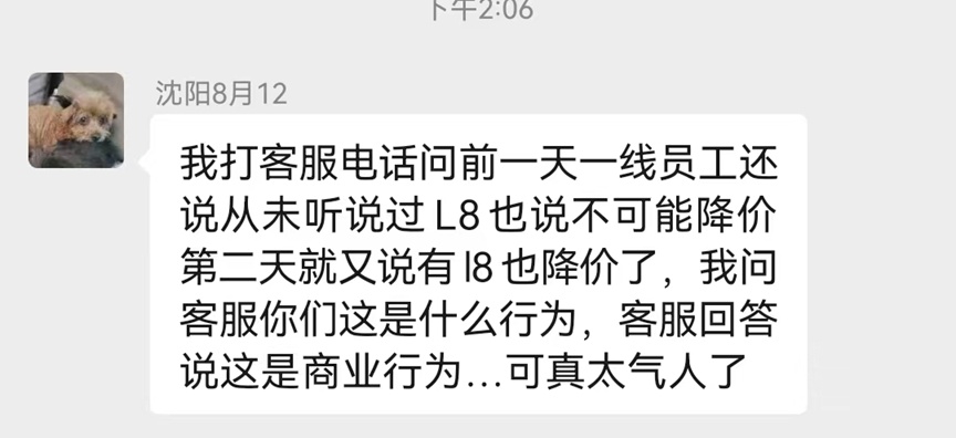 在理想维权群里,一位8月12日提车的车主吐槽:“我打客服问,降价前一天一线,也不可能降价,结果第二天就又说有L8且降价了,我问客服这是什么行为,结果客服回答‘这是商业行为’,就很气人。”