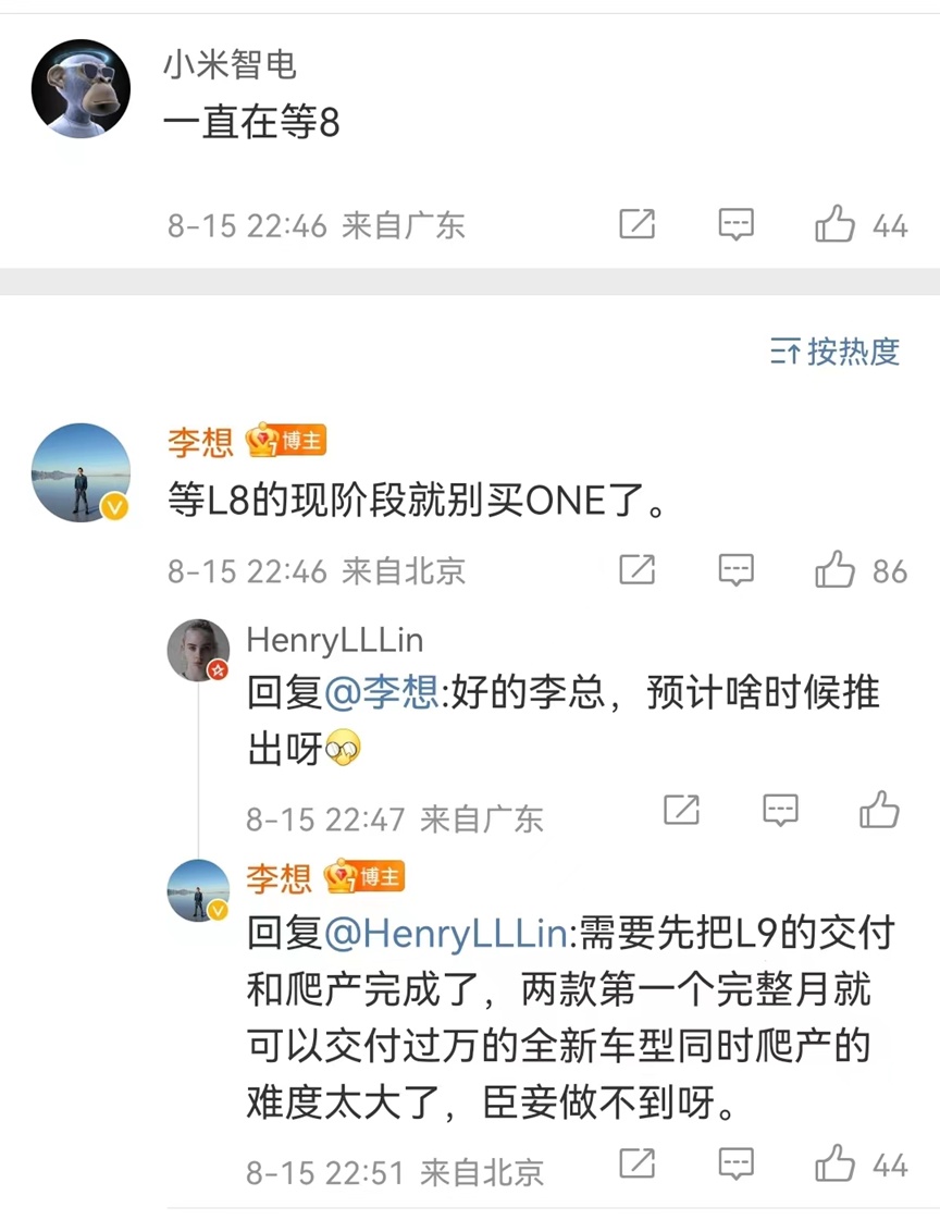 8月15日,在李想的一则微博评论中,李想回复“一直等L8”的网友“等L8的阶段就别买ONE了。”