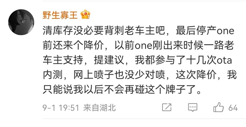 但在20万理想ONE车主看来,他们被抛弃了。“我们提车前就多次问过销售未来理想ONE会不会有降价或者换代,销售表示不会有,结果刚订车一天就降价了,这换谁都会很无语。”8月31日刚提车的李兴如此说道。