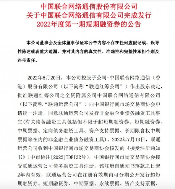 9月2日,联通运营公司完成发行总金额为人民币50亿元的2022年度第一期短期融资券。