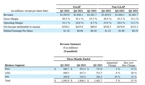 5月6日消息,安森美(onsemi)近日公布了其2022年第1季度业绩,其中: