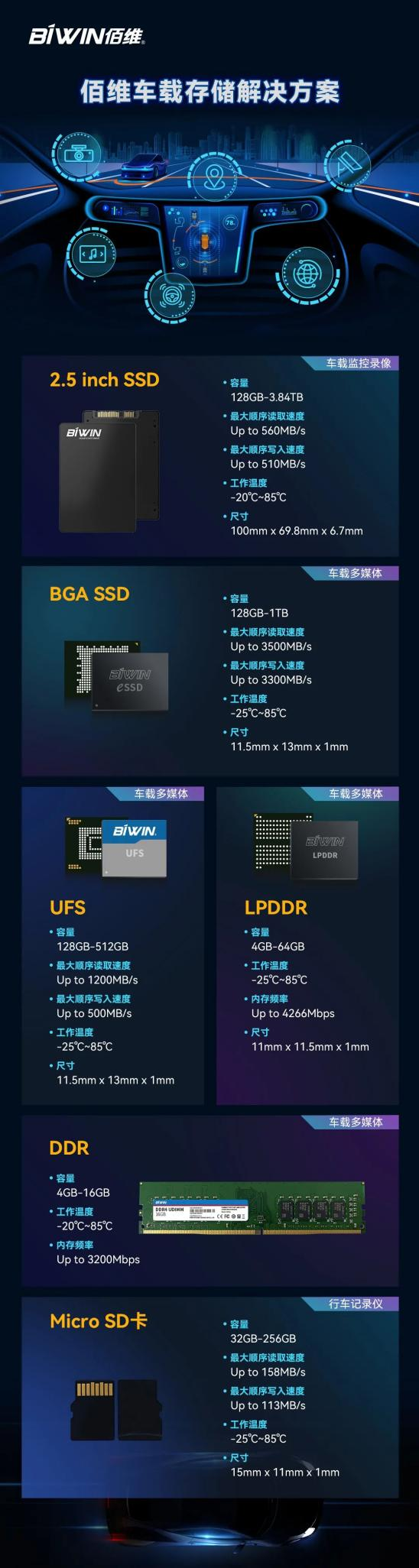 佰维深化布局车载存储领域,结合自身强固设计、宽电压技术、宽温技术、保形涂层技术、抗电磁干扰、断电保护等技术优势,推出了车载存储系列产品,包括SSD、BGA SSD、DDR、UFS、Micro SD卡等,符合IATF16949汽车质量管理体系标准,广泛应用于车载导航系统、车载娱乐系统、行车记录仪、全景监控影像系统、ADAS辅助驾驶系统、轨道交通等。值得一提的是,佰维积极布局打造BGA SSD、UFS、LPDDR等车规级存储,通过贯穿客户需求、产品研发、封测制造等每个环节的管理,保障汽车客户对车规级等级产品的需求。