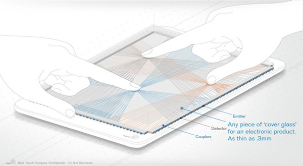 据悉,该公司“受抑全内反射” (frustrated total internal reflection,FTIR)技术是基于低成本LED,它可以创建红外光信号的光学网格,由光电探测器读取。LED和光电探测器被放置在显示器的边缘。该性能不受电容耦合或显示模式噪声的影响,可以在任何尺寸的屏幕上使用。