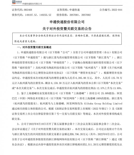 8月22日消息,申通快递日前对外发布公告称,公司全资子公司申通投资管理(舟山)有限公司(简称“申通投资”)拟与浙江菜鸟供应链管理有限公司、浙江仲瑞投资管理有限公司、宁波梅山保税港区福杉投资有限公司及杭州溪鸟物流科技有限公司签署《关于杭州溪鸟物流科技有限公司之增资协议的补充协议》,根据增资补充协议约定,申通投资此次对杭州溪鸟的增资金额为人民币6285。00万元,其中,人民币125。70万元计入杭州溪鸟的注册资本,剩余6159。30万元计入杭州溪鸟的资本公积。