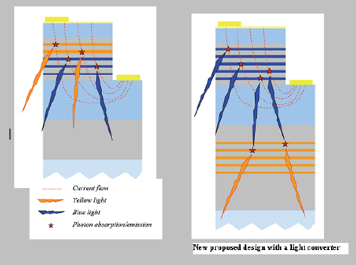 CRHEA-CNRS团队借助在组件p-n接口中的电子主动区生长不同厚度的量子阱,来产生蓝光及黄光,混合后便能产生白光。然而这项设计有个缺陷:激发出的光对于注入的电流变化非常敏感,所以组件的发光效率会被黄光量子阱限制住。