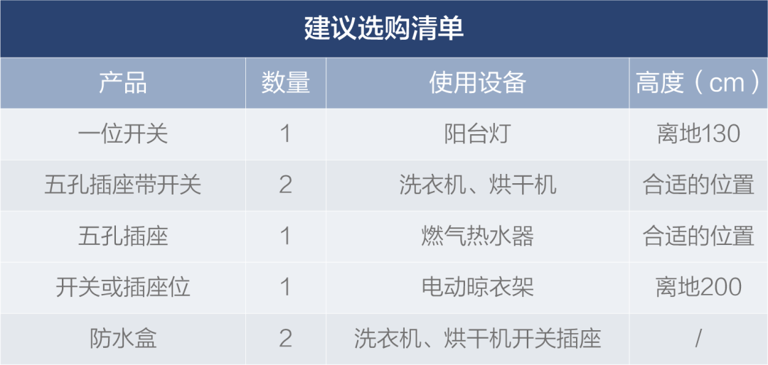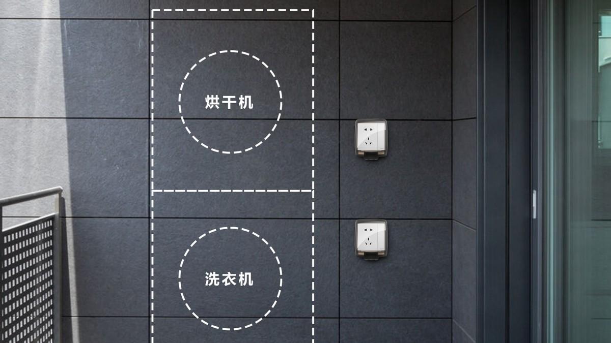 大多数家庭选择将洗衣机、烘干机放置在阳台,则需要在略高于进水口位布局2个五孔带开关插座,无需反复插拔。插座各自加装1个防水盒,防水防尘,使用更安全。