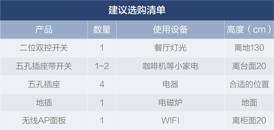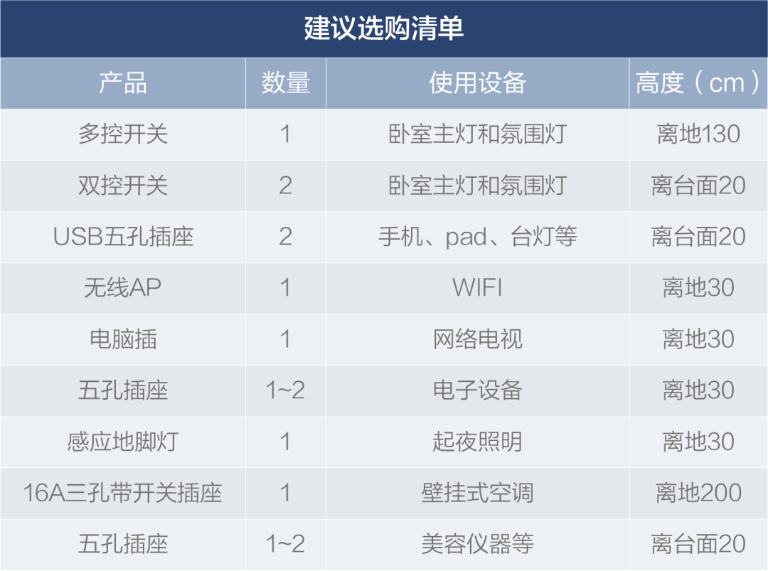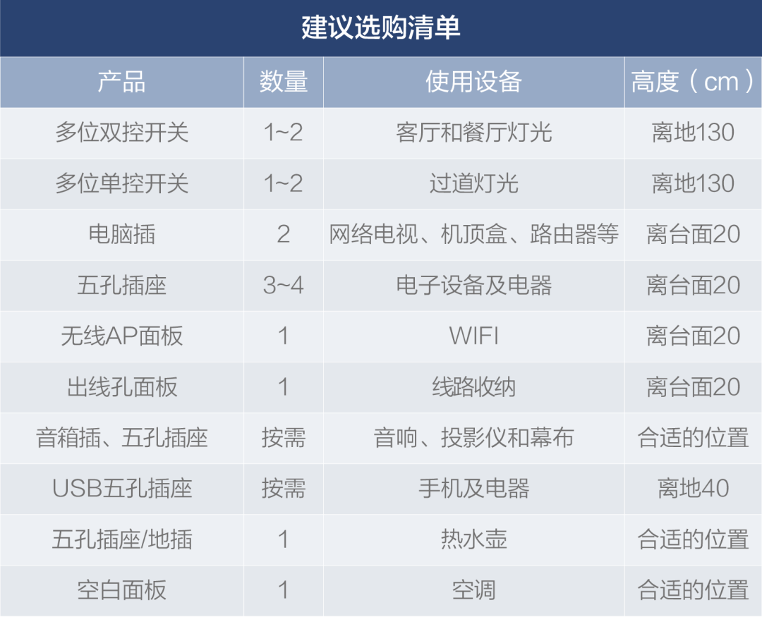 以上场景中建议的开关、插座数量按个人生活习惯和居住情况增减,在相应的位置上多预留插座,是不会出错的。