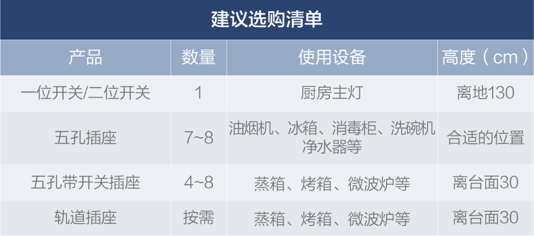 橱柜台面需要放置电饭煲、微波炉、蒸箱、烤箱等家电,可布置4~8个五孔带开关插座,要注意台面上的插座不能离灶具和水槽太近!