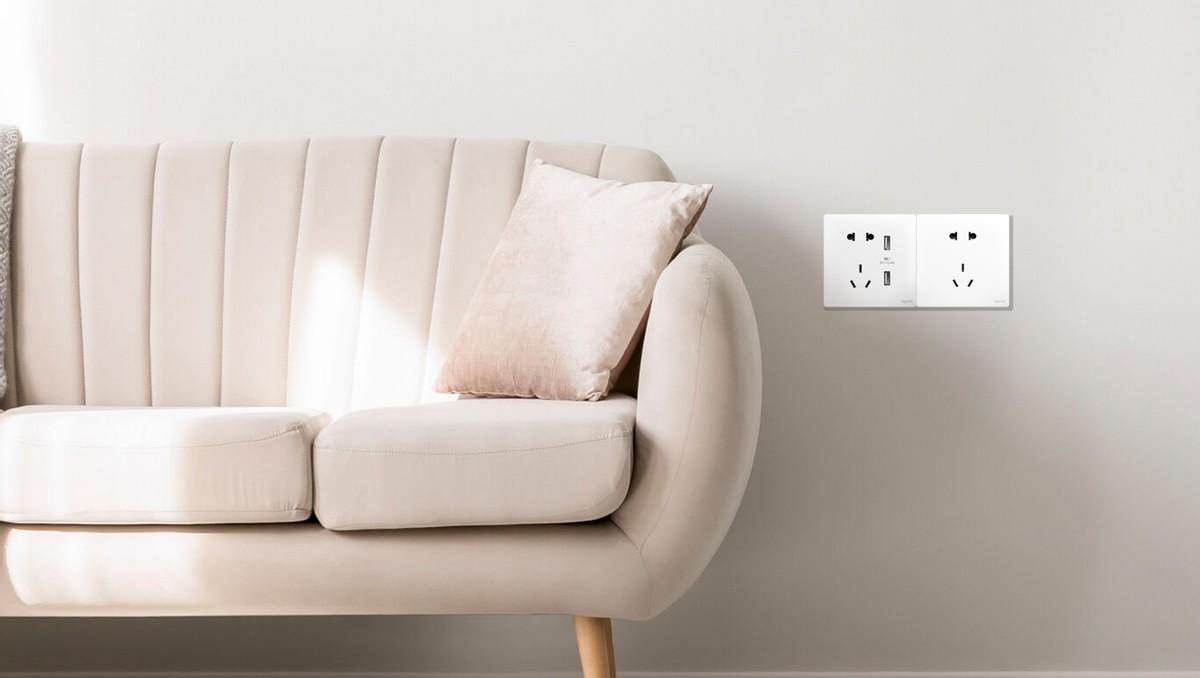 如果沙发是靠着墙面放置,可以在两侧设置USB五孔插座和五孔插座,方便手机充电的同时可以给风扇、落地灯、空气净化器等家电的使用。需要事先预留沙发长度,避免插座被遮挡。