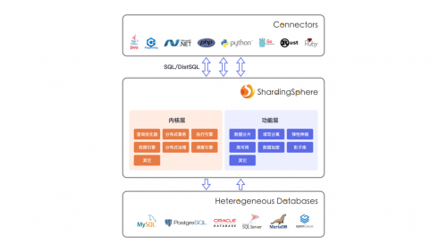 ShardingSphere 已支持 MySQL、PostgreSQL、openGauss 等数据库协议,以及 MySQL、PostgreSQL、openGauss、SQL Server、Oracle 和所有支持 SQL92 标准的 SQL 方言。连接层抽象的顶层接口可供其他数据库开放对接,包括:数据库协议、SQL 解析和数据库访问等。