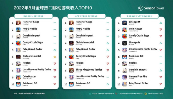 9月16日消息,Sensor Tower今日公布了2022年8月全球热门移动游戏收入TOP10,腾讯《王者荣耀》在全球 App Store 和 Google Play 吸金超过2。22亿美元,蝉联全球手游畅销榜冠军。