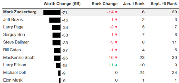 据统计,扎克伯格的个人财富今年损失了一半,相当于蒸发了710亿美元,这在美国超级富豪中排名第一。目前,扎克伯格的财富规模是559亿美元,在全球富豪榜中排名20位,这是他从2014年以来的最低排名,排名不及“沃尔顿家族”三名成员,也落后于科赫家族的两位成员。