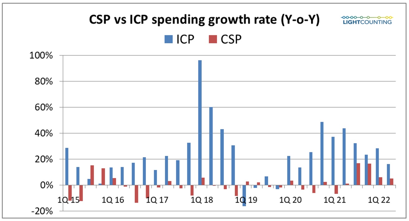 CSP(通信服务提供商)和ICP(互联网内容提供商)都报告了与2021年同一季度相比资本支出的增加。然而,在过去的几个季度里,这两大阵营的资本支出增长率一直在放缓,如下图所示,今年第三季度和第四季度的资本支出持平或为负数并不令人惊讶。
