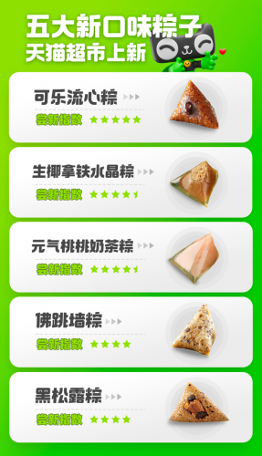 5月17日消息,天猫超市粽子大规模上新,可乐、生椰拿铁、元气桃桃这些年轻人喜欢茶饮口味,今年成了粽子馅,搭配初夏糖果风的包装。