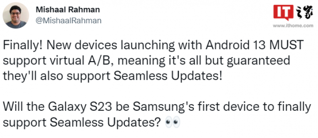 9 月 22 日消息,据安卓爆料者Mishaal Rahman 的一份报告,Android 13 或将强制要求 A / B 分区,可无缝更新系统。