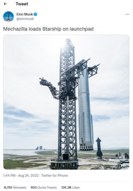 8月23日,SpaceX用Mechazilla巨型机械臂将7号超级重型助推器放置至143米高的发射塔。公司首席执行官埃隆·马斯克(Elon Musk)在社交媒体推特上庆祝了这一工作。他发布了一张关于机械臂牢牢抓住7号超级重型助推器的照片,并配文称,“Mechazilla已经将星际飞船装载到发射台”。