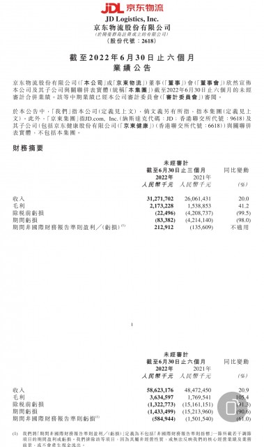 8月23日消息,京东物流公布2022年Q2及上半年业绩。上半年,京东物流营收达586亿,同比增长20。9%;二季度调整后的Non-IFRS净盈利达2。1亿元,毛利率从去年同期的3。7%提升为6。2%。
