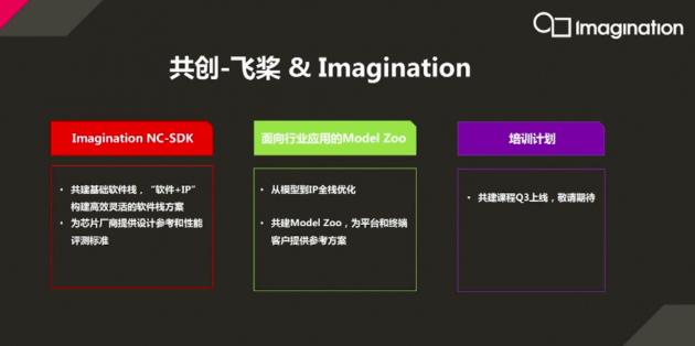 在硬件生态共创计划中,双方基于百度飞桨(PaddlePaddle)对未来硬件计算平台的需求,结合Imagination(GPU,CPU,AI)异构计算IP技术,从算法模型到计算框架再到半导体IP技术通过联合优化的方法,构建高效灵活的软件栈方案,为芯片厂商提供设计指导和Benchmark参考。面向行业应用共建ModelZoo,为平台和终端客户提供参考方案。这种全新的生态合作模式将为双方的客户及合作伙伴带来更多价值。未来,双方将面向使用ImaginationNC-SDK的飞桨开发者共同开发培训课程,进行联合培训认证。