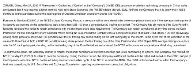 5月28日消息,趣店对外发布公告称,已收到纽约证券交易所于2022年5月25日发出的不合规通知函,原因是其美国存托股份(ADS)平均收盘价在连续30个交易日内低于1美元,被视为低于合规标准。
