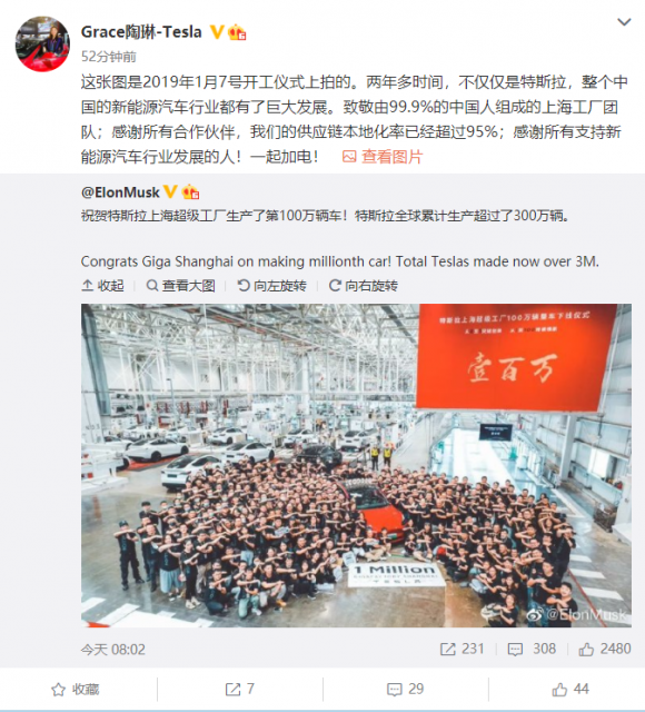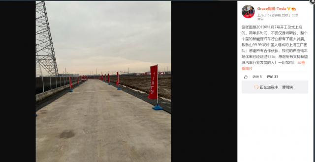 当日午间,特斯拉对外事务副总裁陶琳转发微博表示,“两年多时间,不仅仅是特斯拉,整个中国的新能源汽车行业都有了巨大发展。致敬由 99。9% 的中国人组成的上海工厂团队;感谢所有合作伙伴,特斯拉供应链本地化率已经超过 95%。”