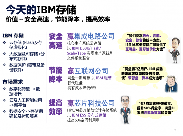 第二,节能降本。现在国内有“双碳”的要求,国内很多客户都非常关注节能。IBM存储通过磁带化、软件化,能够为客户实现节能降本。以某互联网公司的网盘项目为例,通过为其提供磁带替代磁盘,降低了65%的成本。