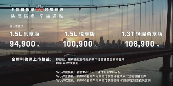 配置方面,全新科鲁泽全系标配小雪OS智能车联系统,具有智能语音交互识别,AR实景导航功能,内置唱吧、优酷、酷我音乐等多种娱乐APP应用,带来智能交互和智能生态的全面提升。全新科鲁泽车机支持无线连接Apple CarPlay、百度CarLife以及华为HiCar等不同互联系统,支持手机无线充电,自带车载相机等。